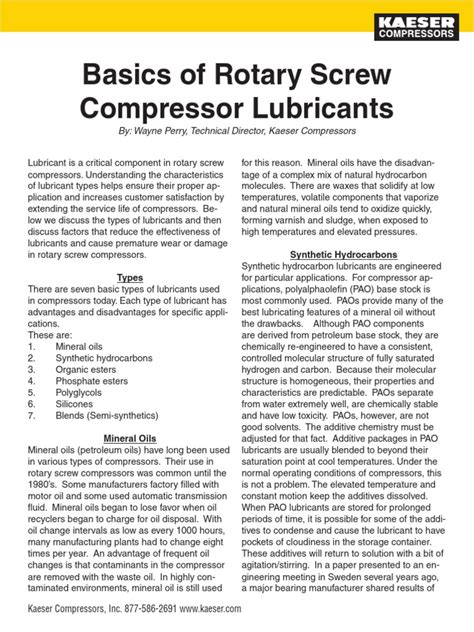 | Nom du fichier: Basics Of Rotary Screw Compressor Lubricants .pdf Taille: 7388 Ko Type: PDF, ePub , eBook |